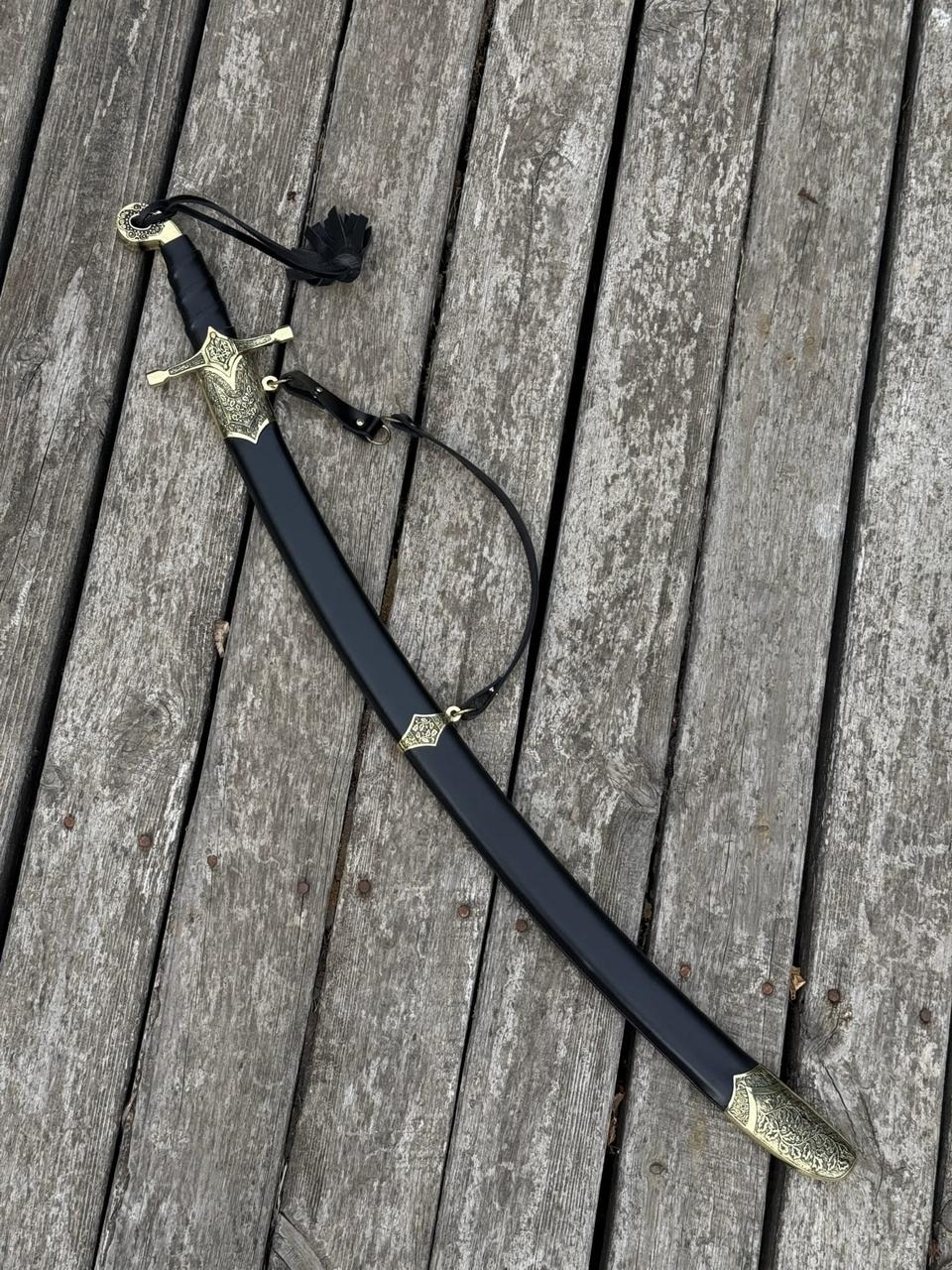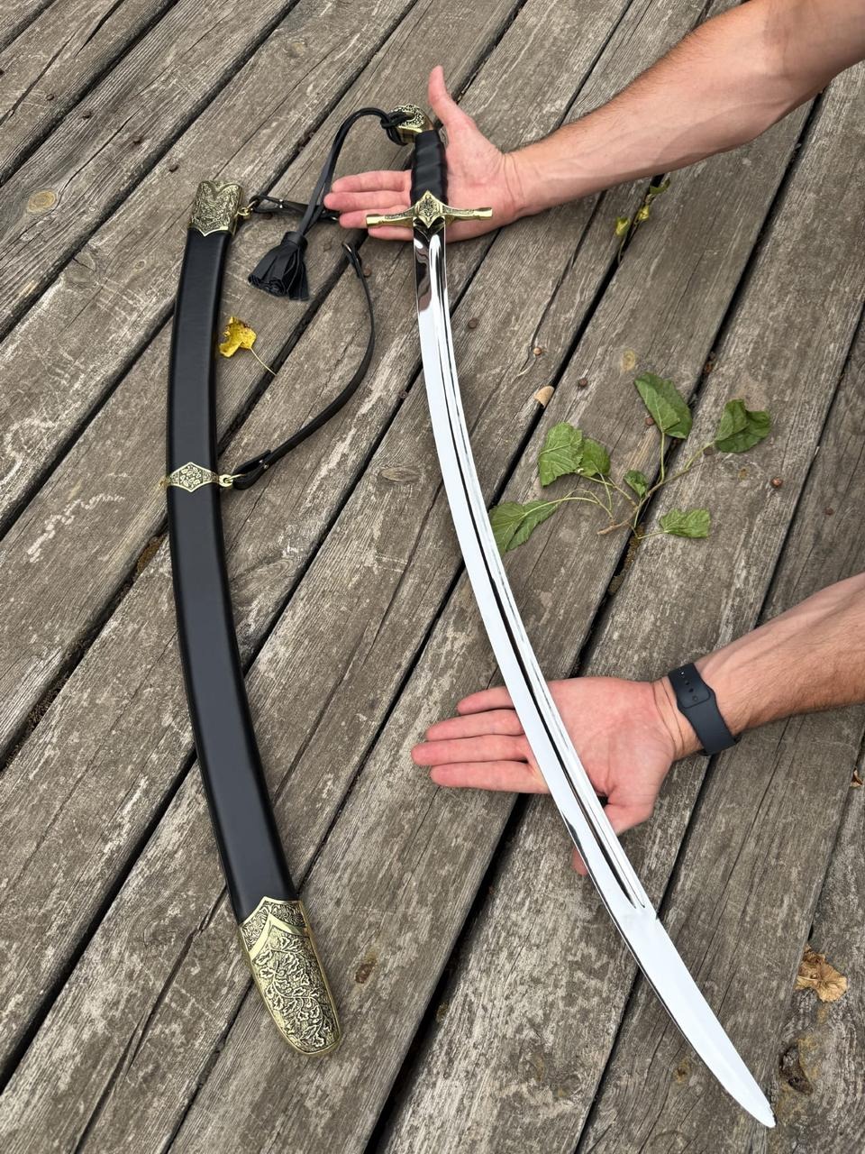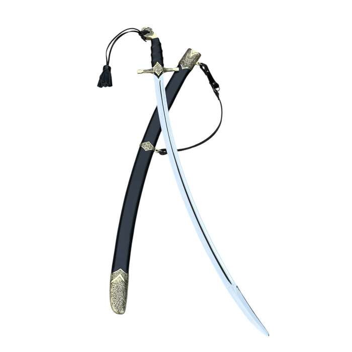 Сабля выполнена с длинным изогнутым клинком, который отличается элегантностью и выразительным блеском стали