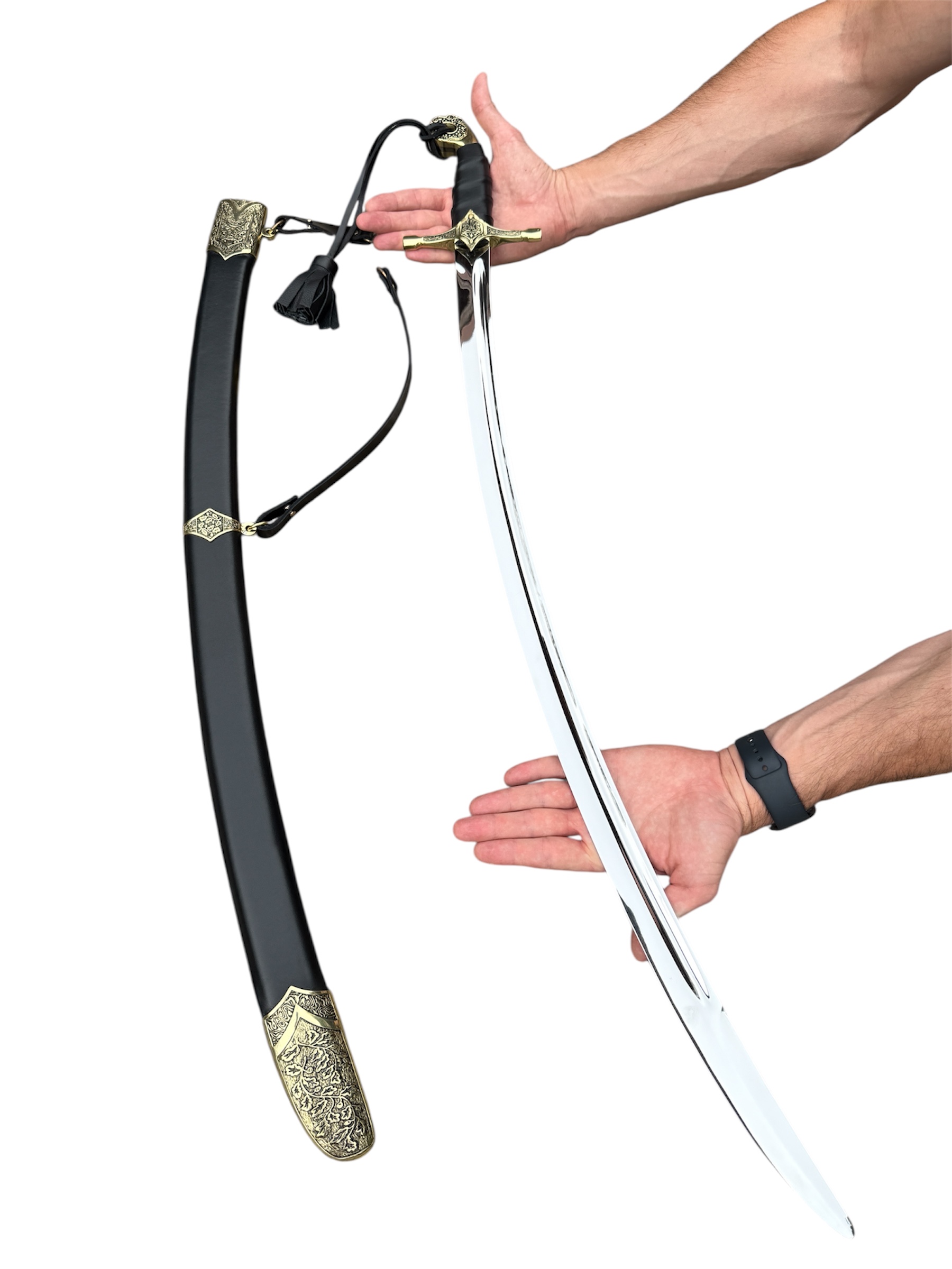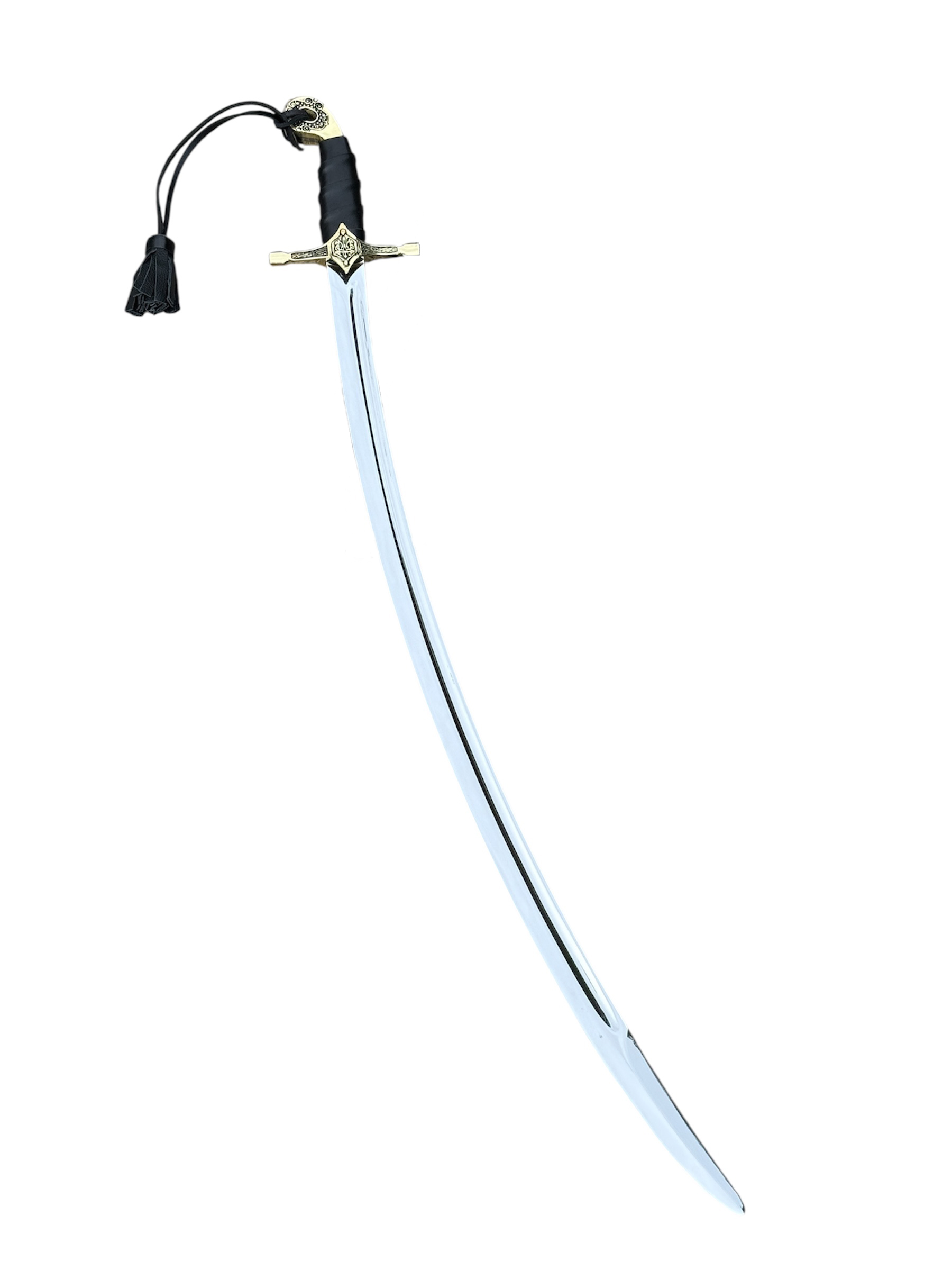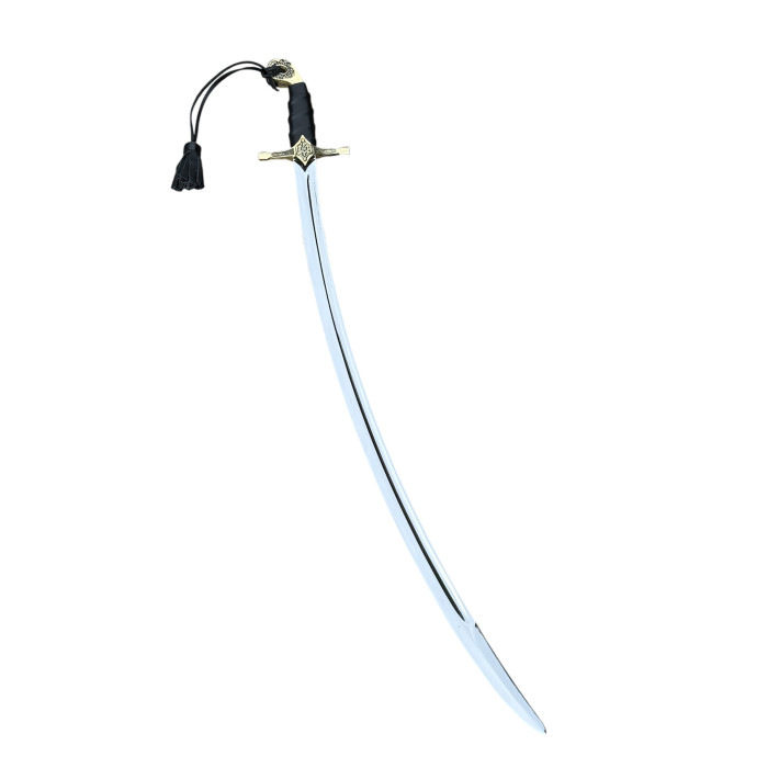 Сабля выполнена с длинным изогнутым клинком, который отличается элегантностью и выразительным блеском стали