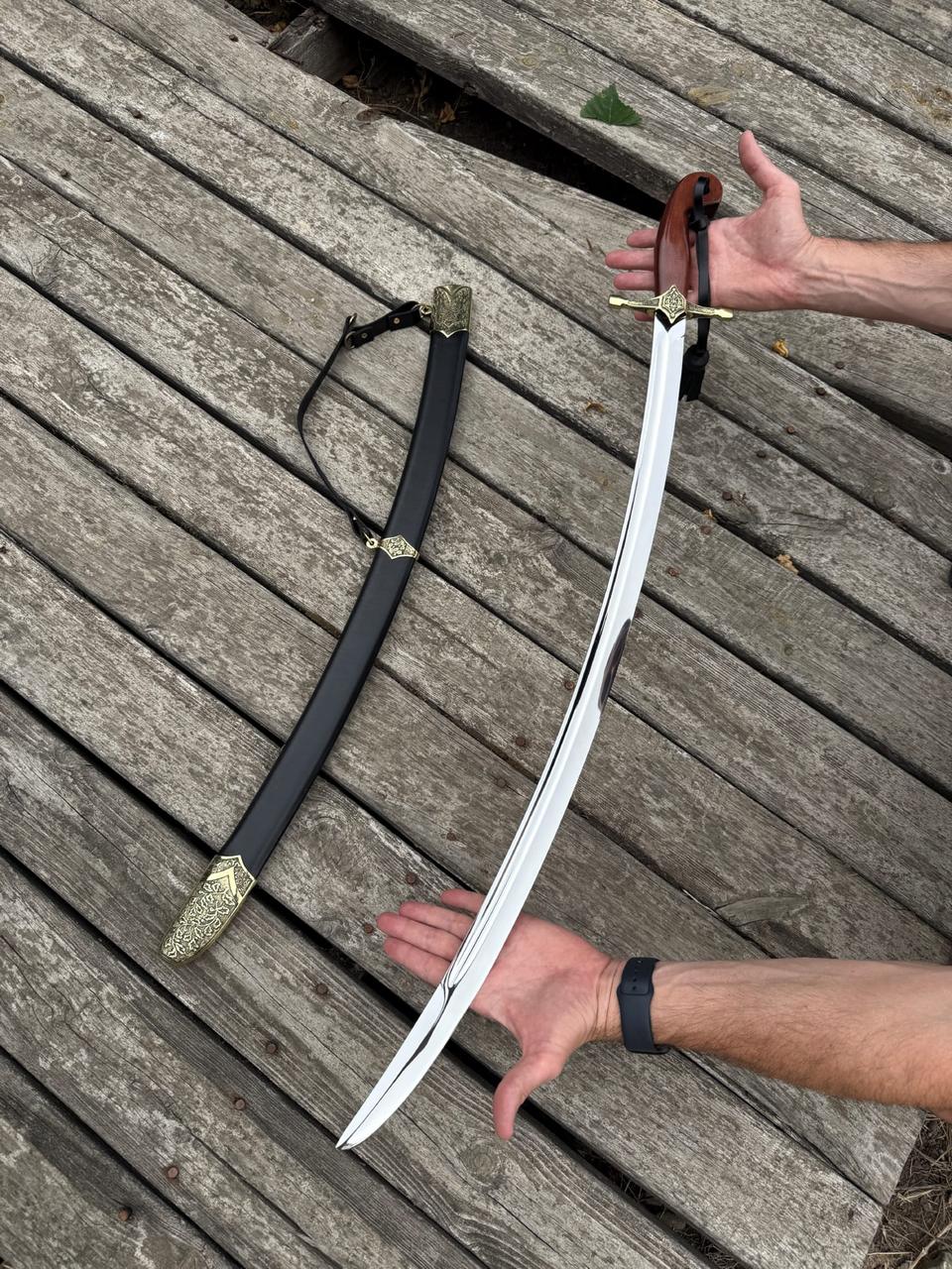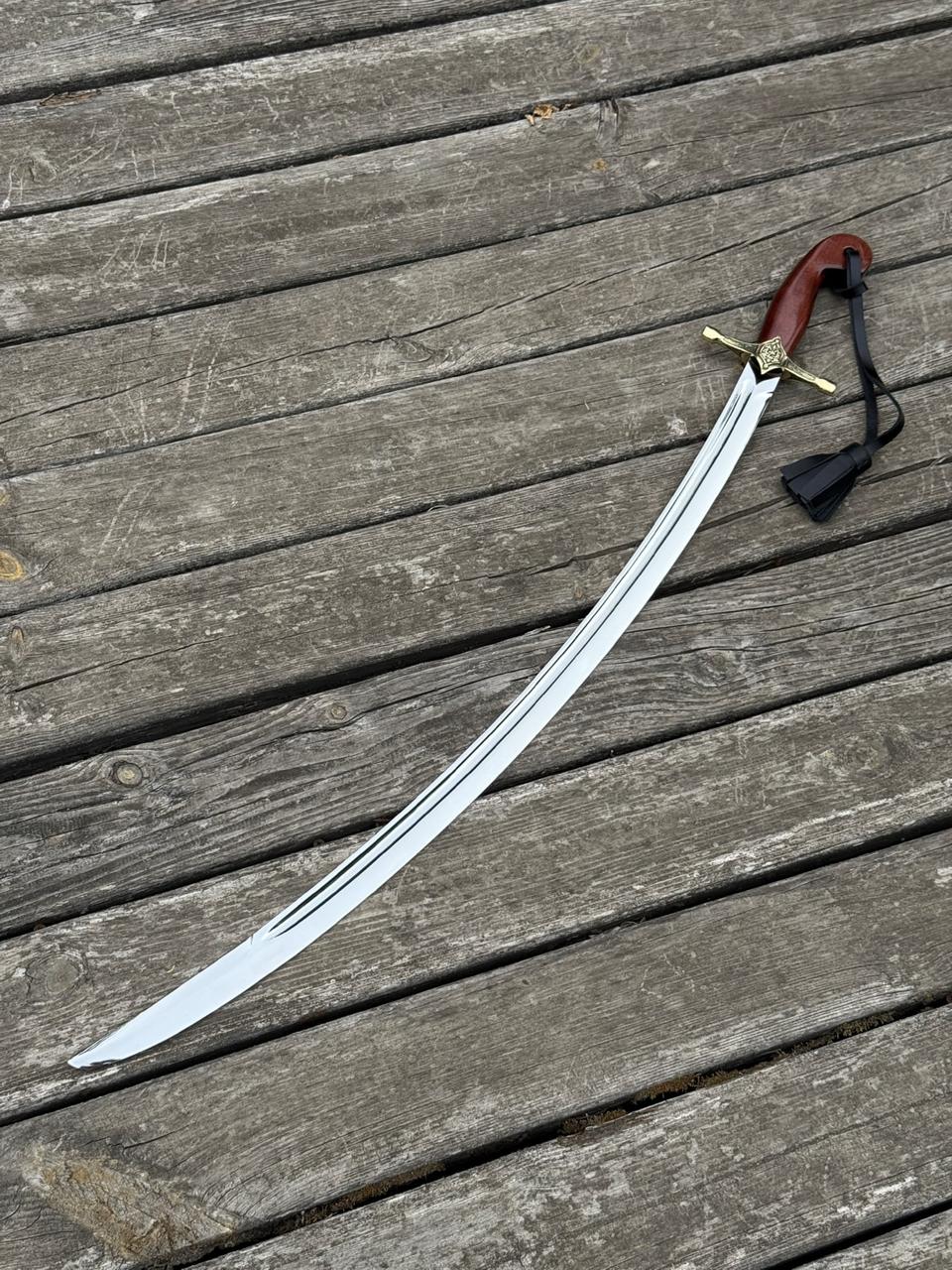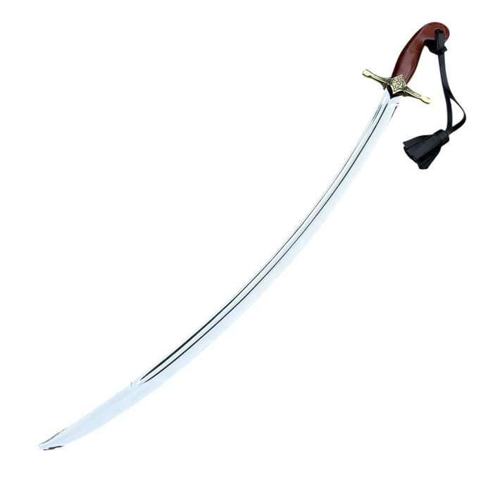 Сабля выполнена с длинным изогнутым клинком, который отличается элегантностью и выразительным блеском стали