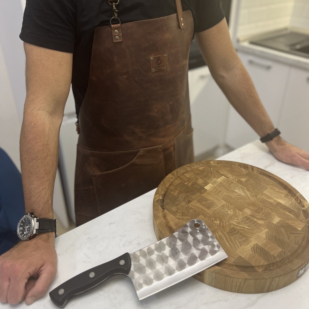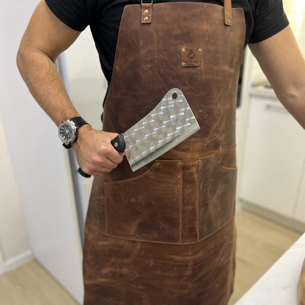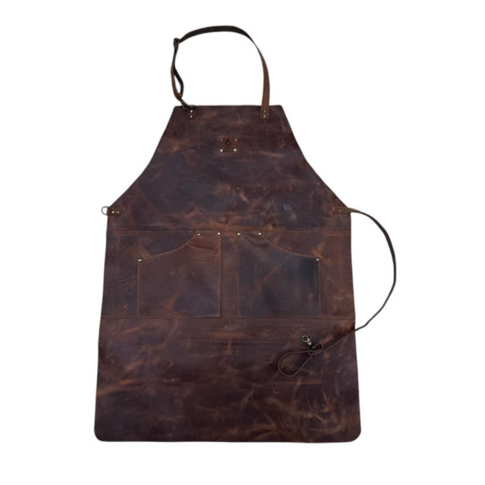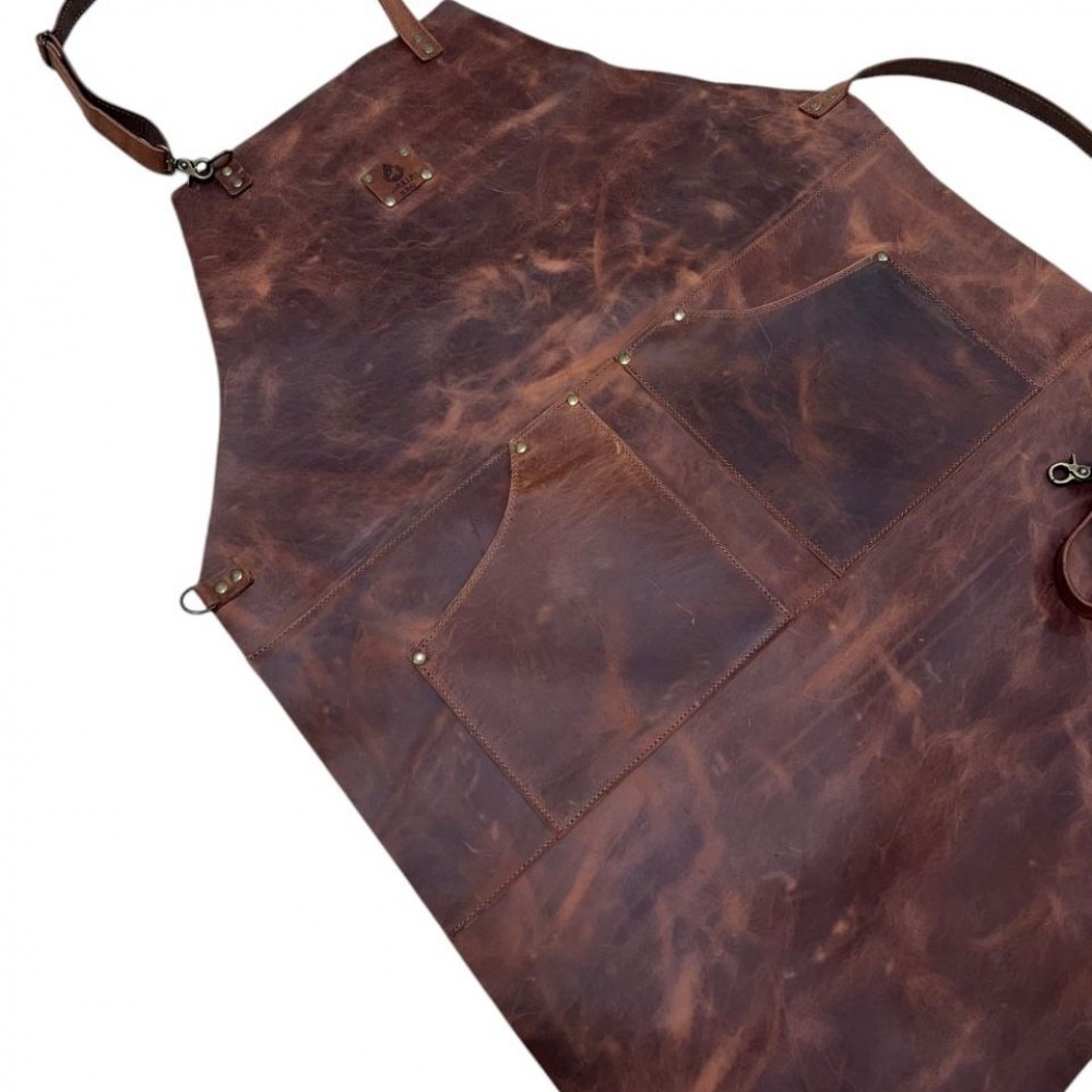 Кожаный фартук подходит для работы с грилем, мангалом или барбекю на улице, обеспечивая защиту одежды и уютную атмосферу процесса приготовления.