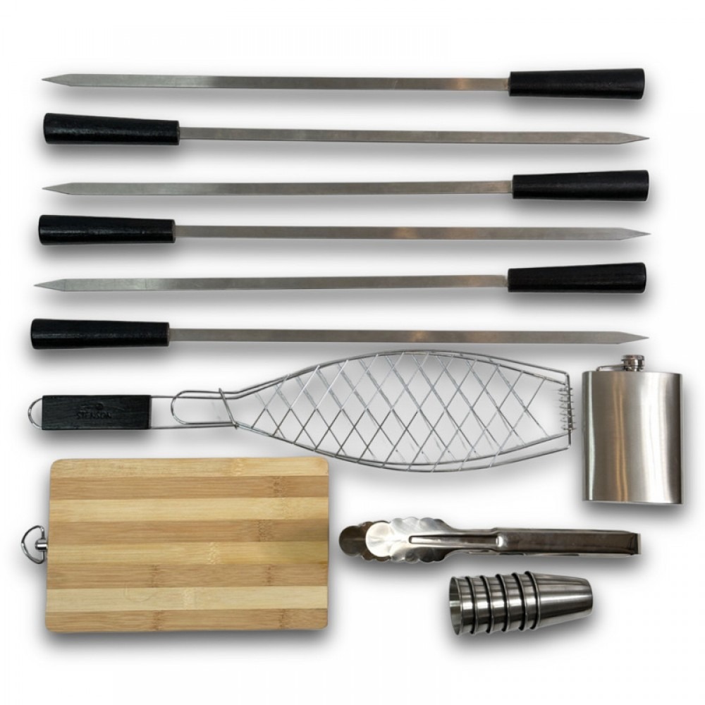 Набор для шашлыка из 18 предметов - отличный подарок для мужчины на любое событие. Подарочный кейс делает его удобным для транспортировки и хранения. Этот универсальный подарок подойдет для дня рождения, юбилея, или просто для любителей отдыха на природе.