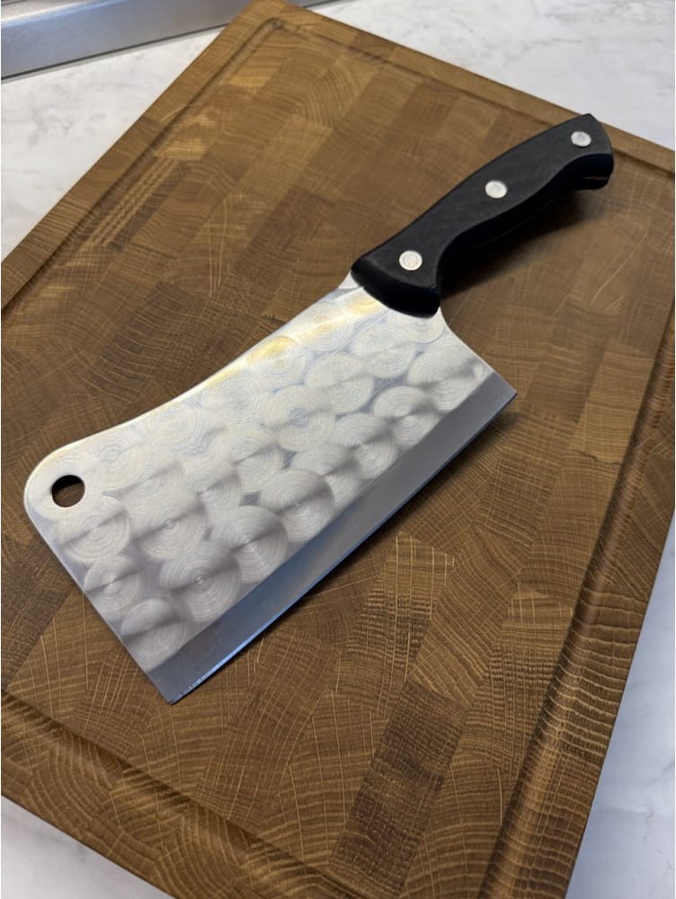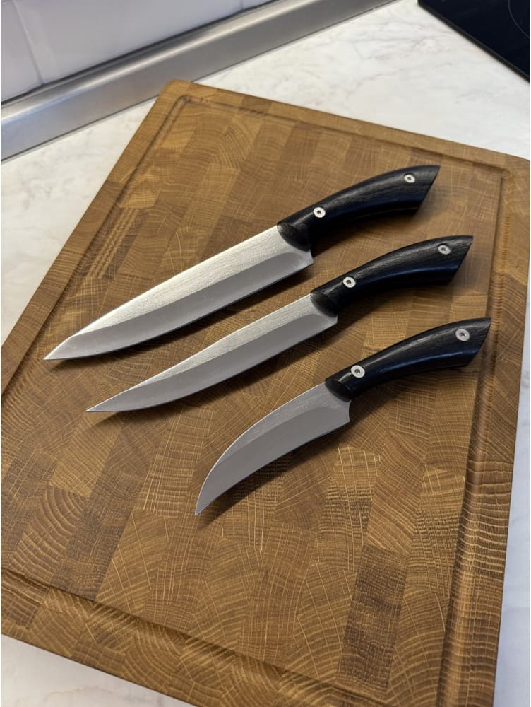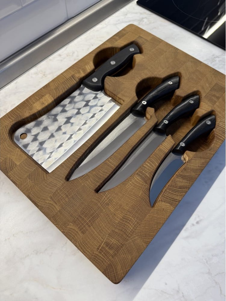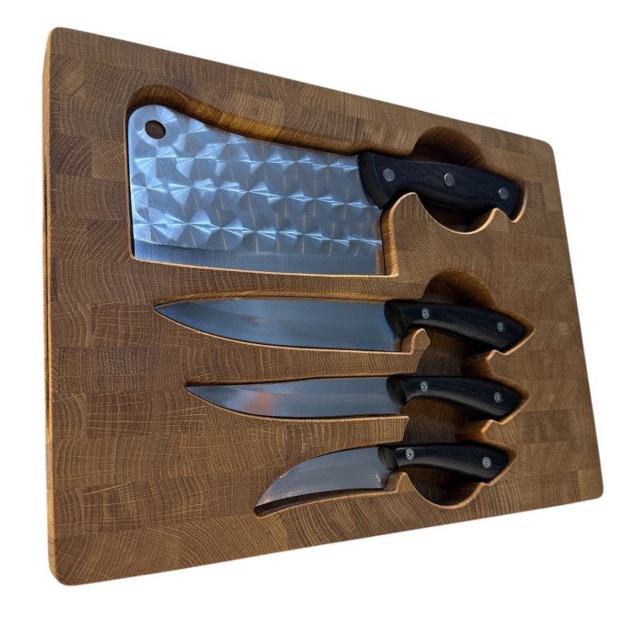 Набор кухонный торцевая доска разделочная с кухонным топориком Узор и набором из 3-х ножей Gorillas BBQ DS44