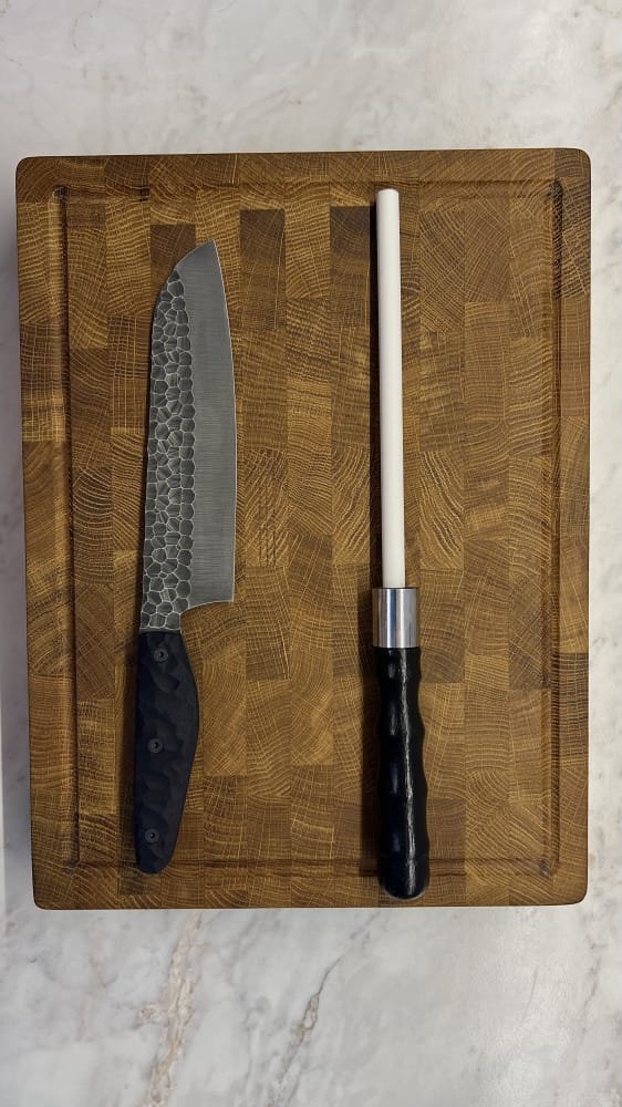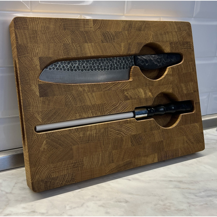 Набор кухонный торцевая разделочная доска с кухонным ножом Шеф и мусатом Gorillas BBQ DS36