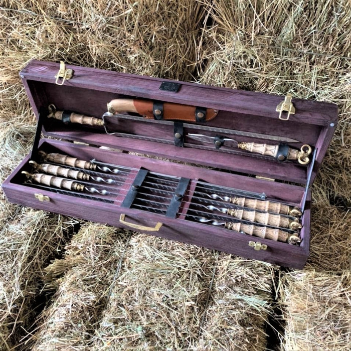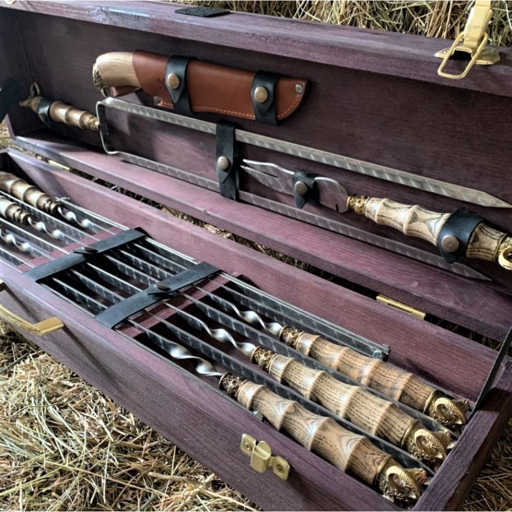 Набор для шашлыка из 10 предметов - отличный подарок для мужчины на любое событие. Подарочный кейс делает его удобным для транспортировки и хранения. Этот универсальный подарок подойдет для дня рождения, юбилея, или просто для любителей отдыха на природе.