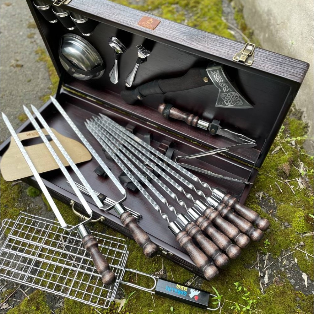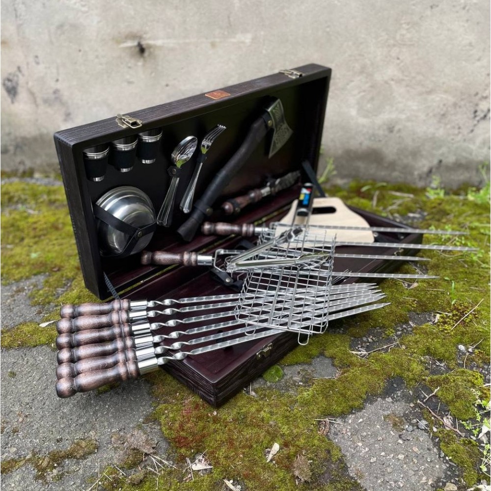 Набор для шашлыка из 42 предметов - отличный подарок для мужчины на любое событие. Подарочный кейс делает его удобным для транспортировки и хранения. Этот универсальный подарок подойдет для дня рождения, юбилея, или просто для любителей отдыха на природе.
