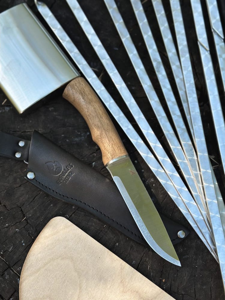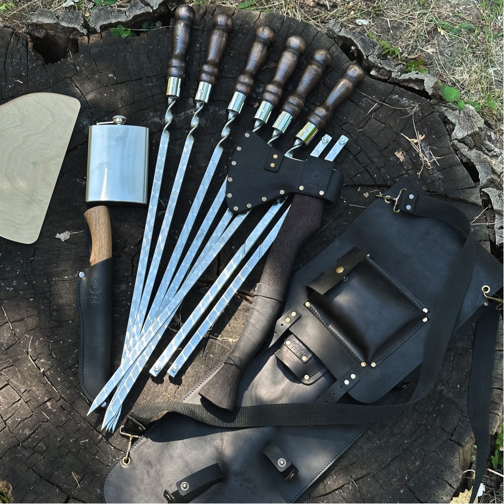 Набор для шашлыка из 10 предметов - отличный подарок для мужчины на любое событие. Подарочный кожаный чехол делает его удобным для транспортировки и хранения. Этот универсальный подарок подойдет для дня рождения, юбилея, или просто для любителей отдыха на природе.