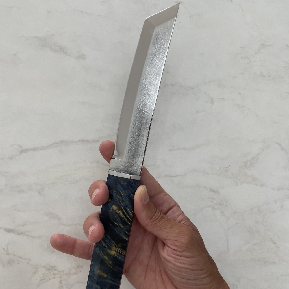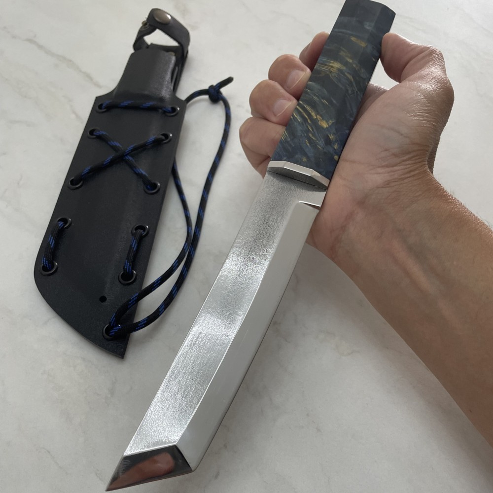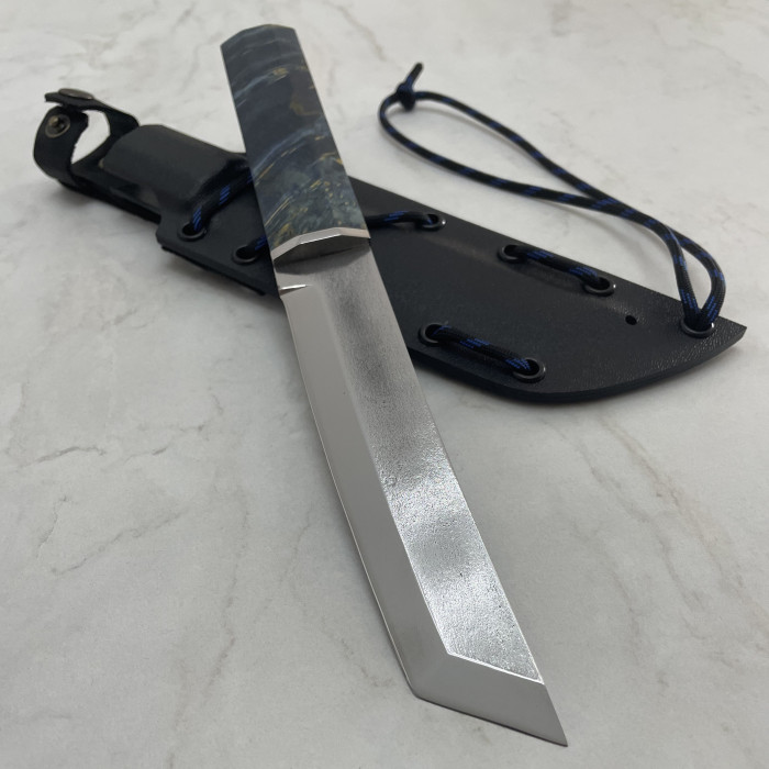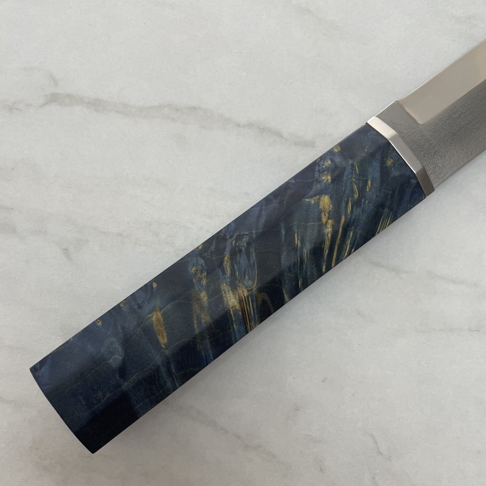 Нож выполнен по схеме Full Tang, что придаёт ему прочность и устойчивость к нагрузкам. Накладки из стабилизированного капового клена создают надёжный хват и эстетичный внешний вид.