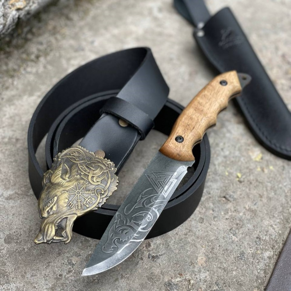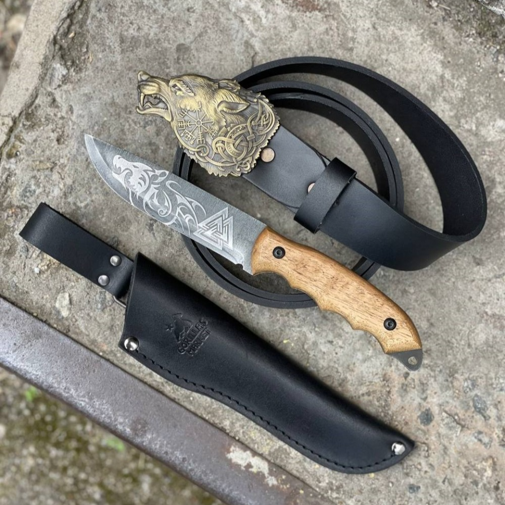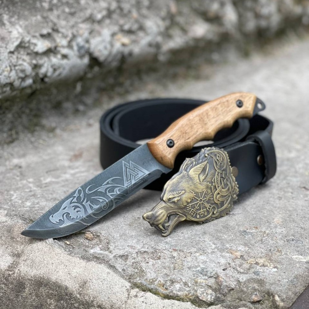 Набор включает нож для выживания с художественным травлением, кожаный чехол, ремень, латунную пряжку, подарочную коробку и декоративный наполнитель