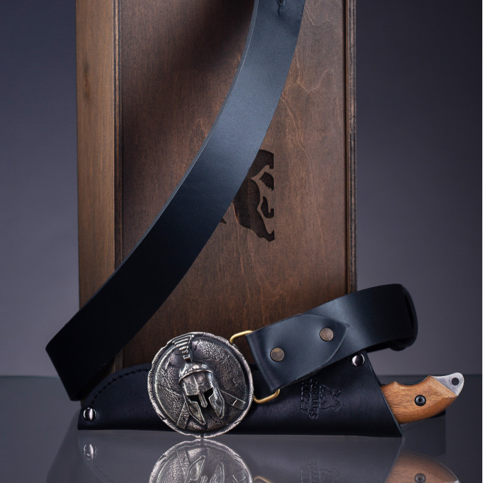 Набор включает нож для выживания с художественным травлением, кожаный чехол, ремень, пряжку из нейзильбера, подарочную коробку и декоративный наполнитель