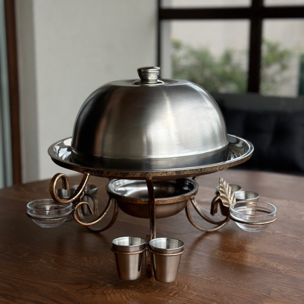 Основным преимуществом саджа является его способность сохранять температуру и ароматы без потери вкусовых качеств блюда. Это заслуга мини-жаровни, которая устанавливается под основным блюдом с едой. На нижнее блюдо кладется уголь, свеча или сухое горючее, на верхнее – готовое мясо. И это блюдо будет оставаться горячим в течение нужного времени.