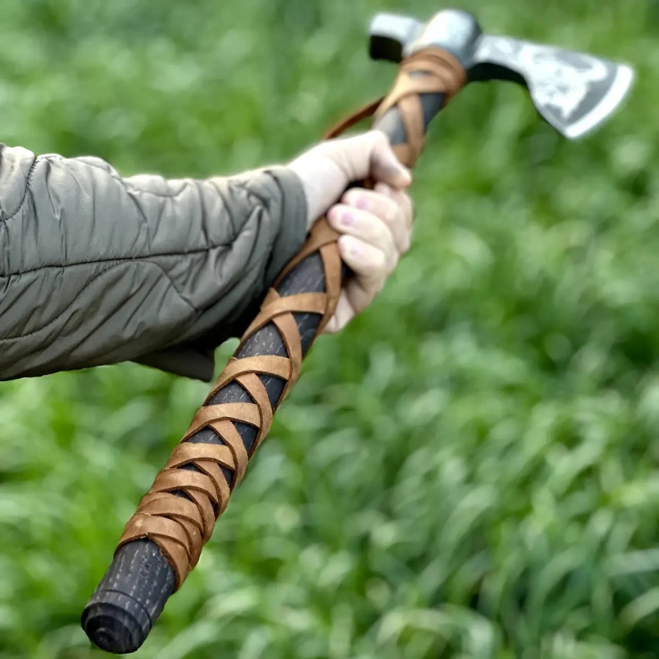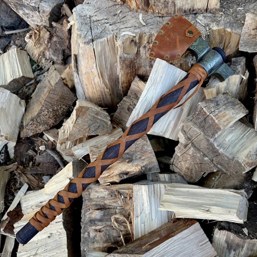 Голова топора декорирована выразительными узорами, что придаёт изделию характер и делает его настоящим произведением ремесленного искусства