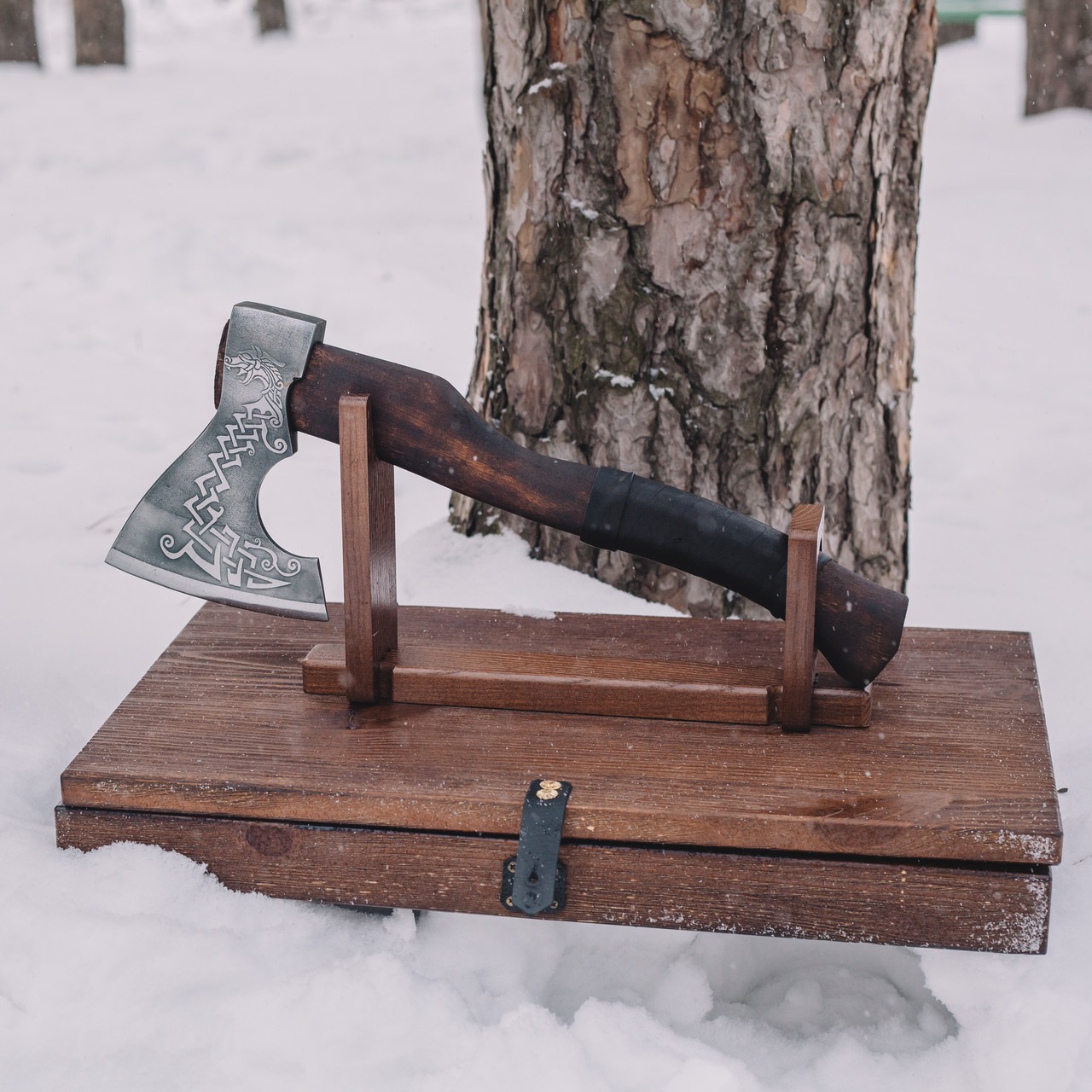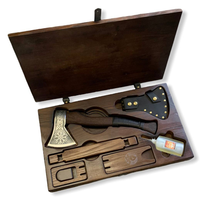 Топор поставляется в деревянной коробке ручной работы, дополненной кожаным чехлом и подставкой. Такая подача превращает его в готовый, стильный и запоминающийся подарок, который подчеркнёт внимание и уважение к получателю.