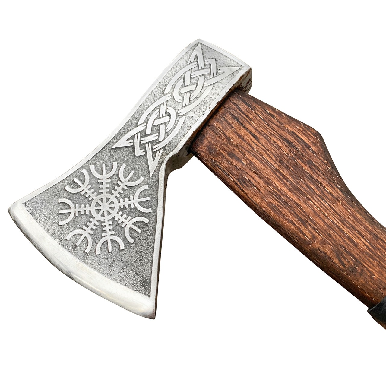 Лезвие топора украшено скандинавскими узорами, которые придают изделию характер и выразительность, превращая его не только в инструмент, но и в эффектный декоративный элемент