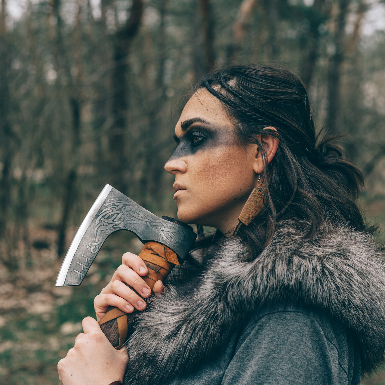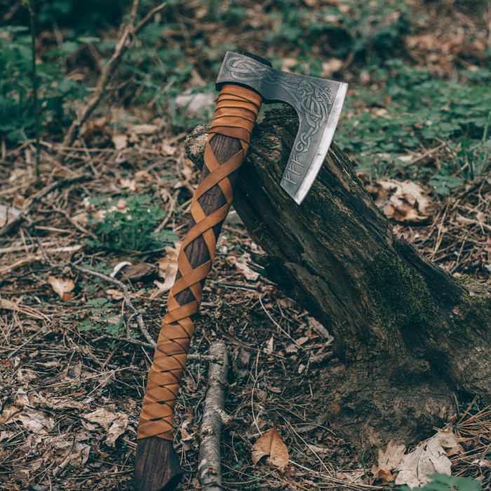 Голова топора декорирована выразительными узорами, что придаёт изделию характер и делает его настоящим произведением ремесленного искусства