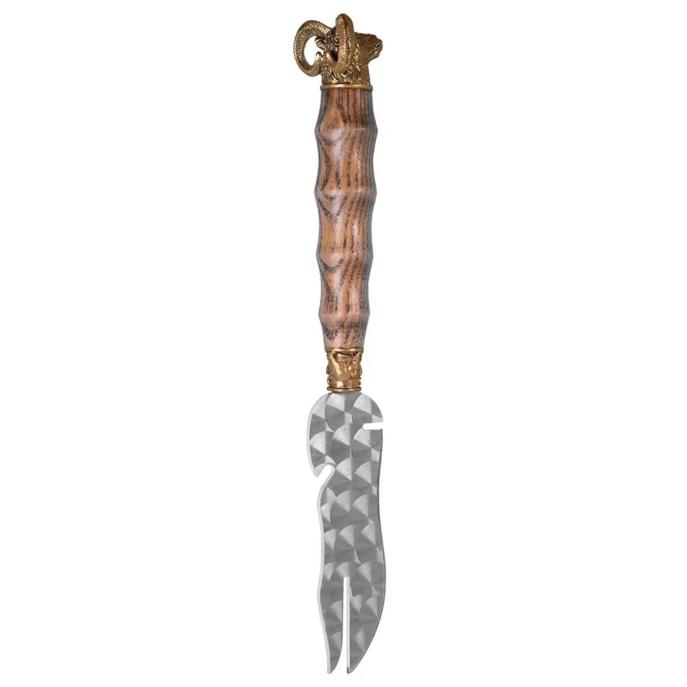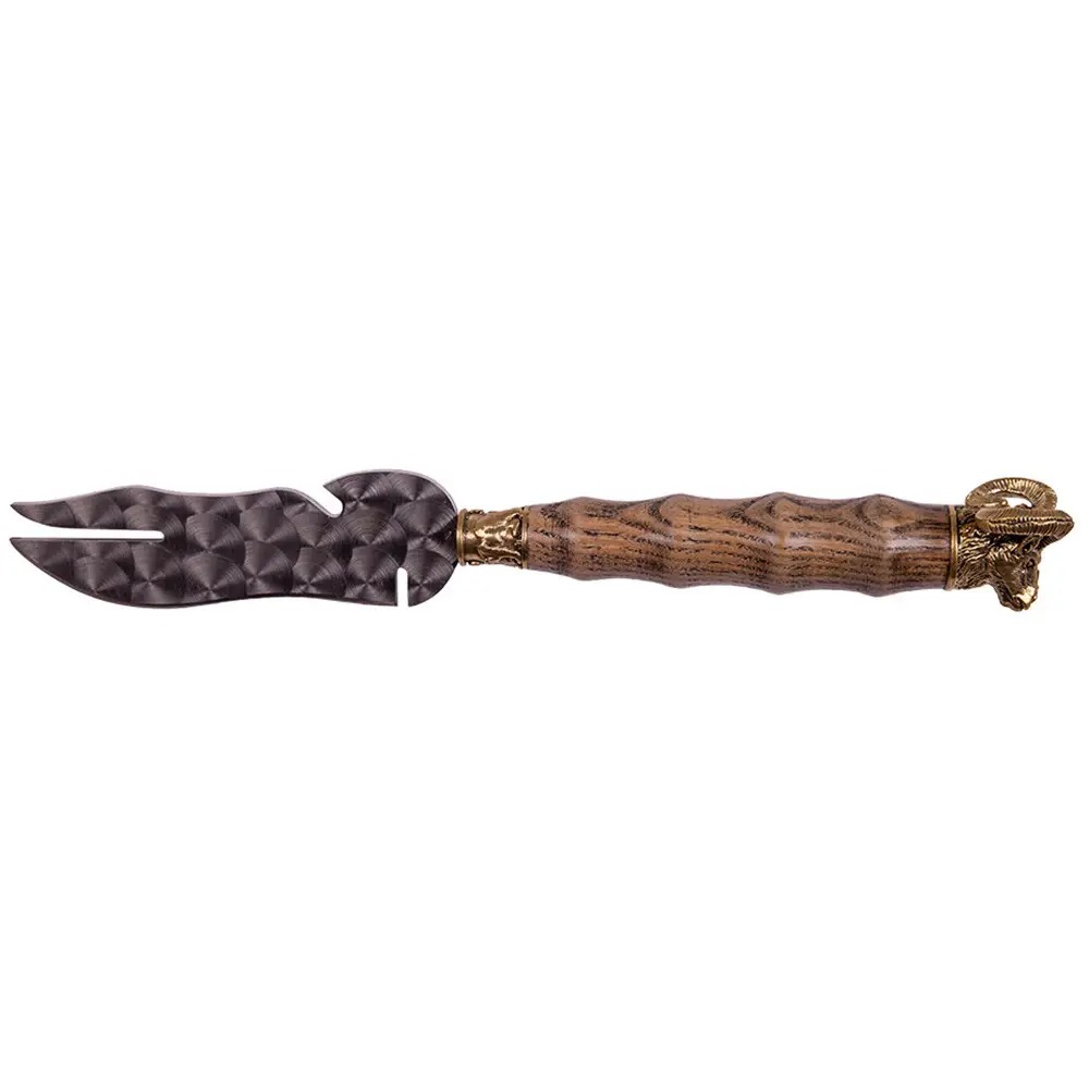 Отличный помощник при приготовлении шашлыка и отдыха на природе. Специальная прорезь позволяет снимать мясо удобно вдоль шампура. Открывалка для открытия бутылок тоже будет очень полезна. Удобная деревянная ручка покрыта несколькими слоями качественного лака - это сохранит ручку от царапин и повреждений. Украшена художественным литьем из бронзы.