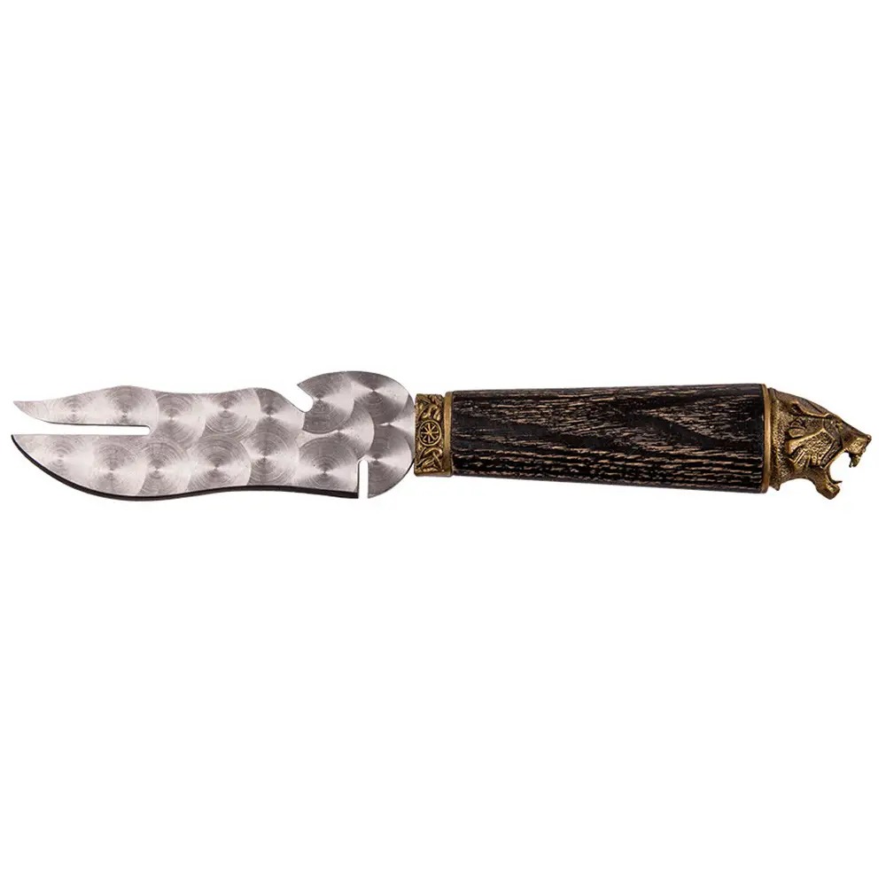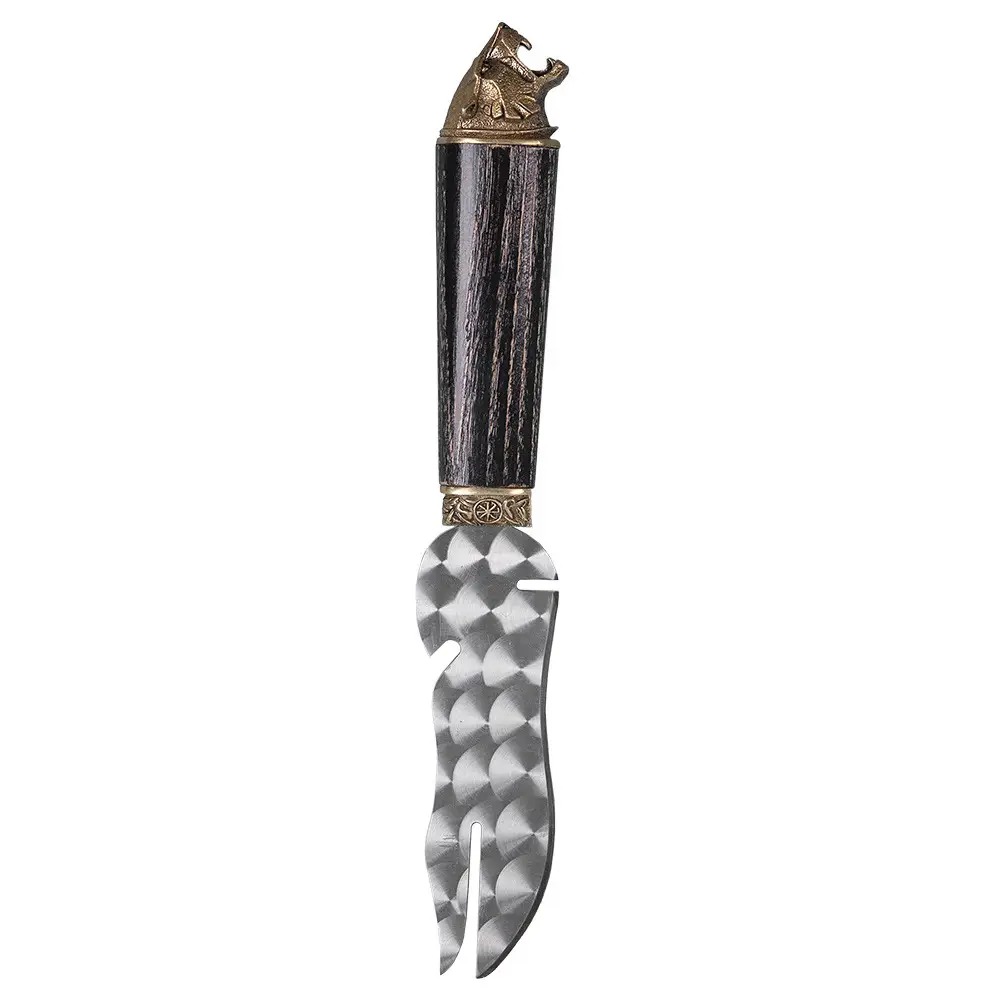 Отличный помощник при приготовлении шашлыка и отдыха на природе. Специальная прорезь позволяет снимать мясо удобно вдоль шампура. Открывалка для открытия бутылок тоже будет очень полезна. Удобная деревянная ручка покрыта несколькими слоями качественного лака - это сохранит ручку от царапин и повреждений. Украшена художественным литьем из бронзы.