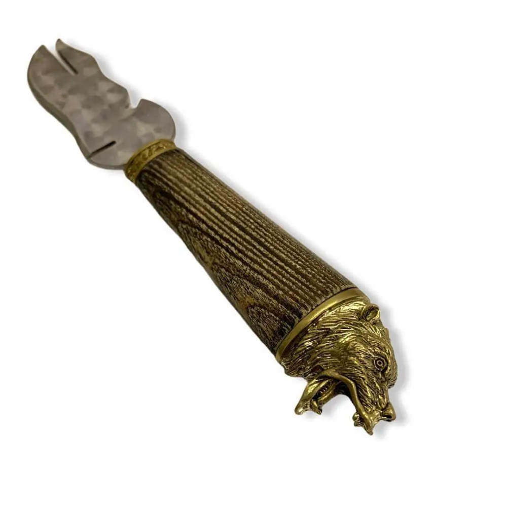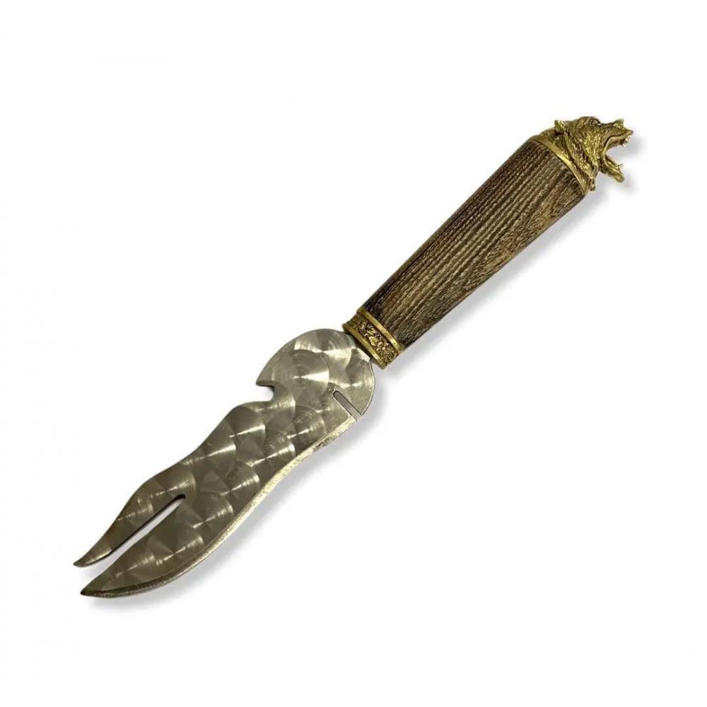 Отличный помощник при приготовлении шашлыка и отдыха на природе. Специальная прорезь позволяет снимать мясо удобно вдоль шампура. Открывалка для открытия бутылок тоже будет очень полезна. Удобная деревянная ручка покрыта несколькими слоями качественного лака - это сохранит ручку от царапин и повреждений. Украшена художественным литьем из бронзы.