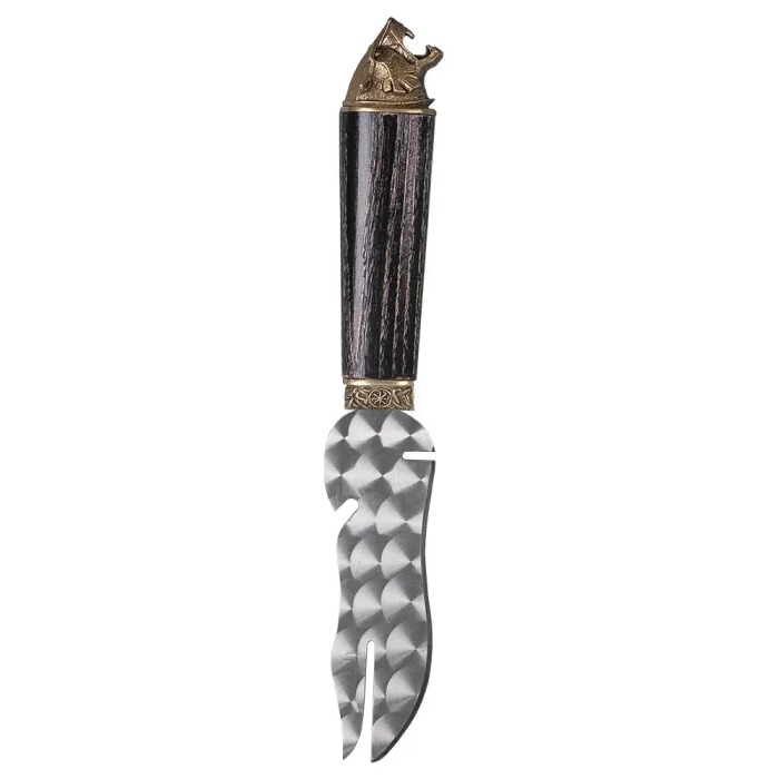 Отличный помощник при приготовлении шашлыка и отдыха на природе. Специальная прорезь позволяет снимать мясо удобно вдоль шампура. Открывалка для открытия бутылок тоже будет очень полезна. Удобная деревянная ручка покрыта несколькими слоями качественного лака -это сохранит ручку от царапин и повреждений. Украшена художественным литьем из бронзы.