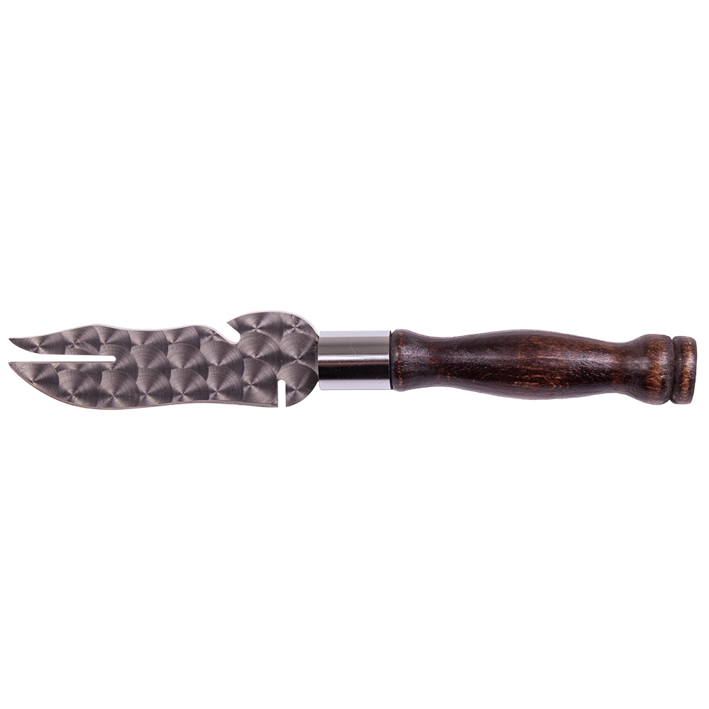 3 в 1 вилка, нож и открывалка. Изготовлена из нержавеющей стали марки AISI430 толщиной 3 мм. Благодаря специальной прорези вы комфортно сможете снять мясо вдоль шампура, проверить готовность шампура, нарезать овощи или открыть бутылочку холодного напитка. Так же вилка-нож отлично подходит когда нужно почистить лезвия шампура или решетку от прилипшей и подгоревшей еды. Удобная деревянная ручка покрыта несколькими слоями качественного лака - это сохранит ручку от царапин и повреждений.