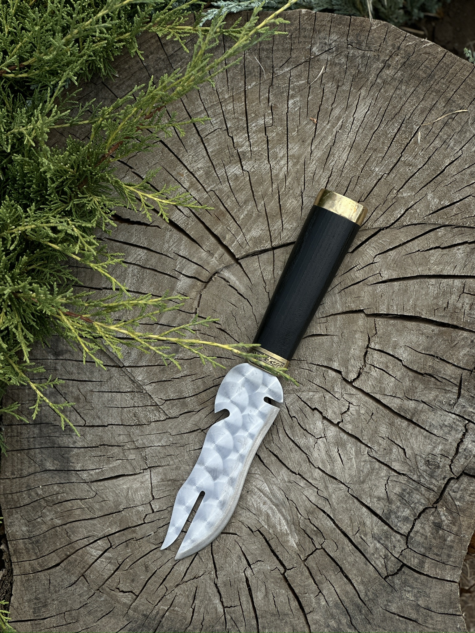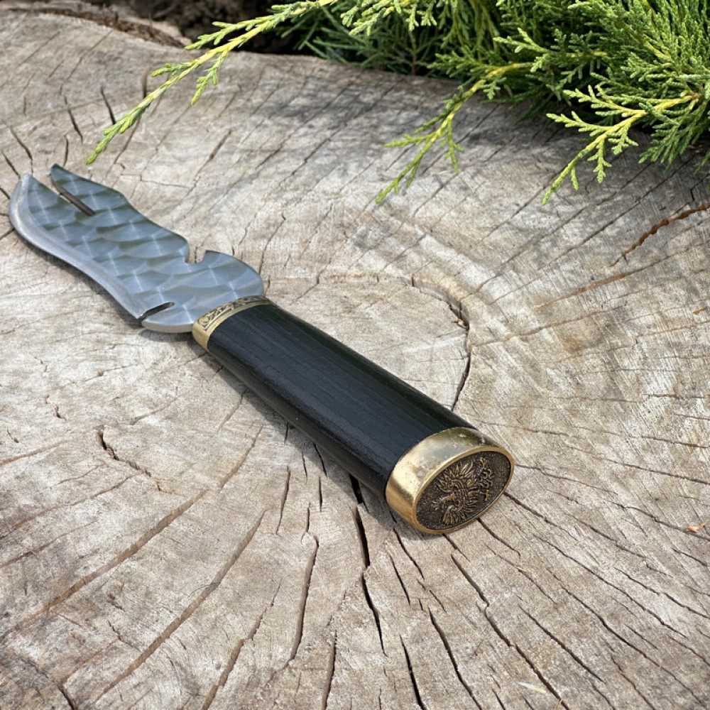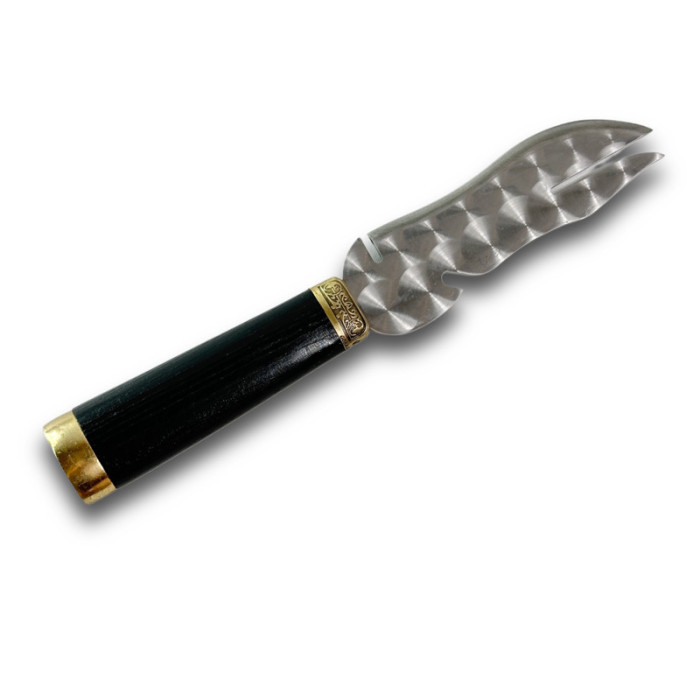 Очень удобные и практичное изделие. Можно сразу и наколоть и разрезать кусок мяса! Рукоятка украшена художественным литьем.